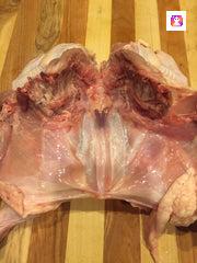 Open the chicken once the backbone is removed. At this point you can remove the breast bone (optional) if you like. You will see it in the middle of this photo below.